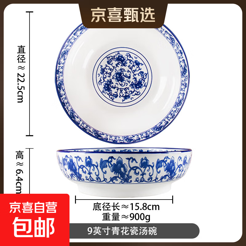 厨房家用9英寸汤盆水煮鱼专用大碗酸菜鱼陶瓷大汤碗新款餐具组合 青花瓷9英寸汤碗 2件套