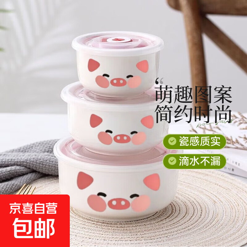 保鲜碗陶瓷带盖上班族便当盒微波炉饭盒冰箱收纳盒泡面汤碗储物碗 粉色小猪【三件套】