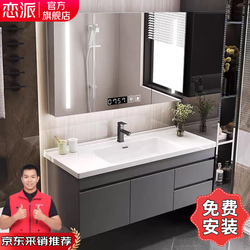恋派浴室柜 陶瓷一体盆卫生间洗脸盆柜组合悬挂式洗漱台智能洗手盆柜 智能全境】珠光灰+陶瓷盆 80cm