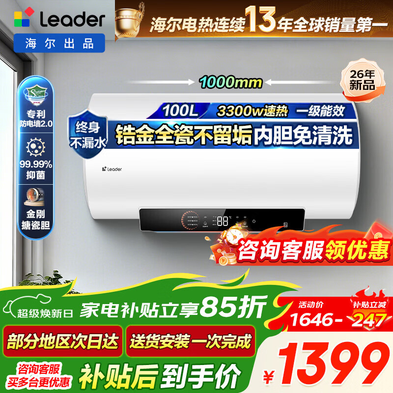 海尔(Haier)国家补贴电热水器100升 抑垢净水洗 3300W变频速热节能 水质监测宽屏大户型沐浴 家用商用大容量 100L 3300W 锆金全瓷/内胆免洗/超一级能效