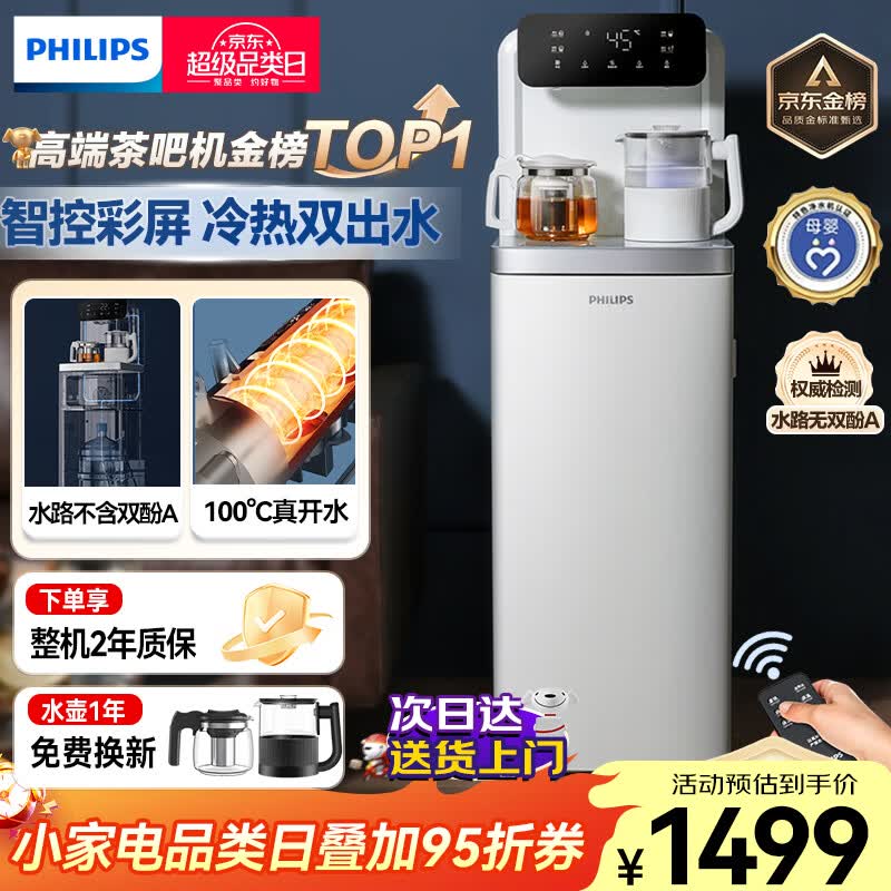 飞利浦(PHILIPS)高端智能茶吧机家用全自动上水饮水机下置水桶遥控款 客厅办公室专用 白色【ADD8021CWHR1】 制冷制热型