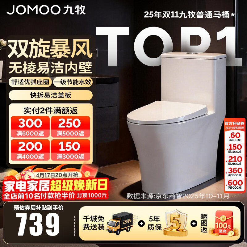 九牧(JOMOO)马桶家用一级水效防臭卫浴虹吸式马桶坐便器大冲力抗菌卫生间坐厕 【双旋暴风-无棱内壁】11396 305坑距(2515城包安装)