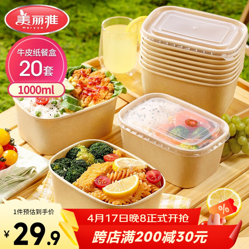 美丽雅一次性饭盒方形1000ml*20套 食品级野餐外卖水果牛皮纸打包盒带盖