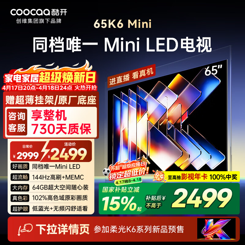 酷开创维电视65K6 Mini 65英寸 Mini LED 64GB 一级能效以旧换新国家补贴 大屏AI游戏平板电视机65P5F