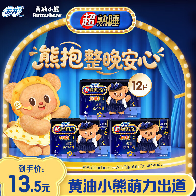 苏菲【黄油小熊联名】卫生巾夜用超熟睡420柔棉感量大姨妈巾旗舰店 黄油小熊 350mm 12片