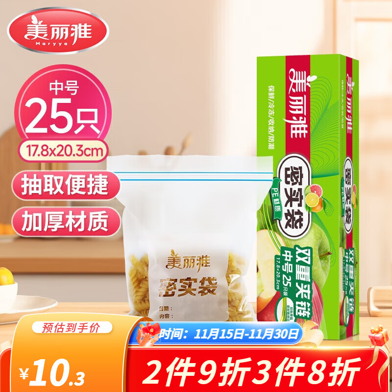 美丽雅收纳袋 食品级加厚自封袋 家用厨房分装收纳袋防水防潮可微波炉 【中号】25只装