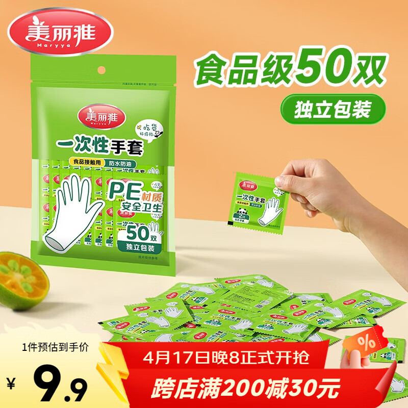 美丽雅一次性手套独立包装50双 食品用升级加厚手套pe厨房餐饮家务手套