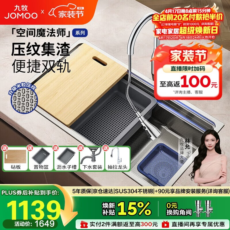 九牧(JOMOO)不锈钢压纹滤渣窄边双轨水槽大单槽厨房洗菜盆75*43抽拉龙头02373