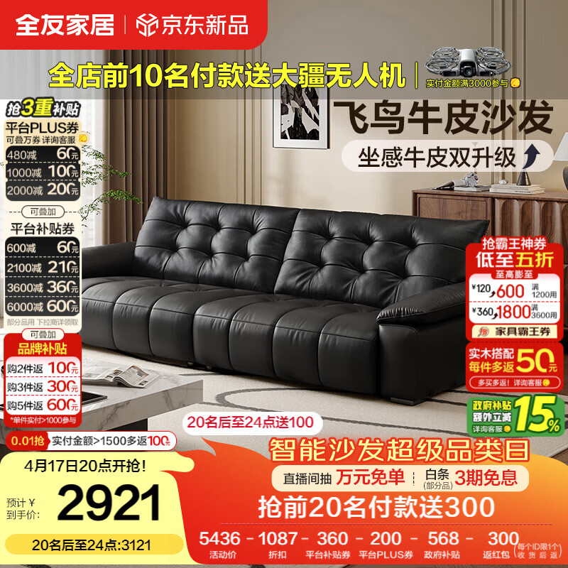 全友家居复古轻奢风头层牛皮沙发客厅家用大黑牛真皮艺直排式飞鸟沙发
