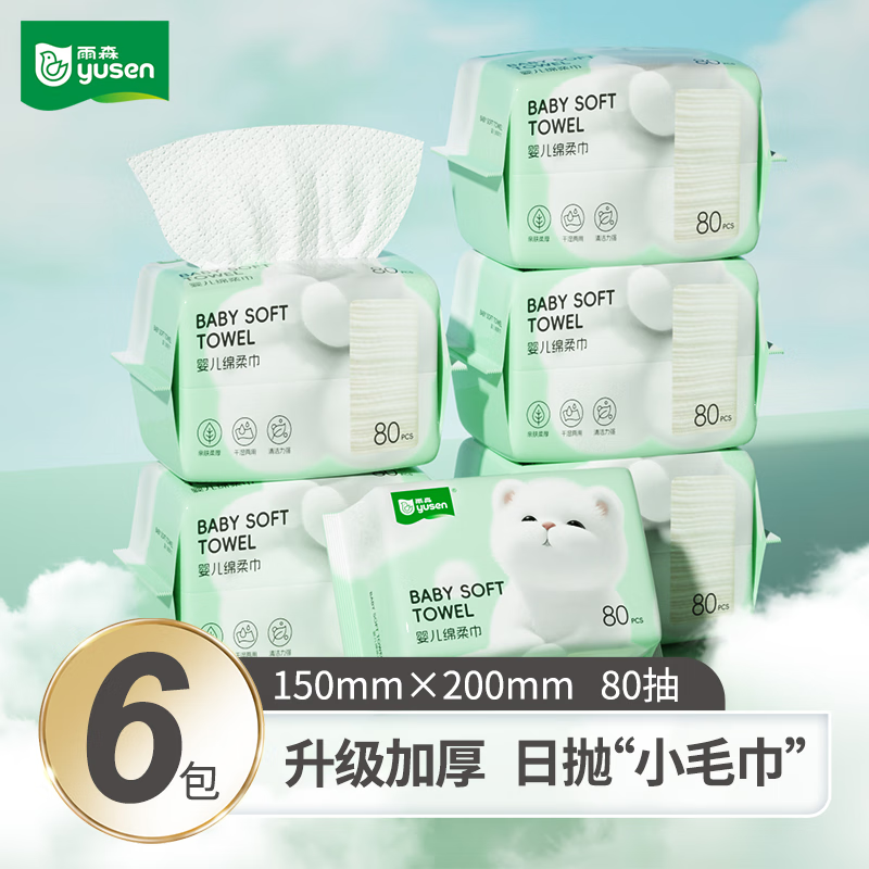 雨森(YUSEN)啵啵熊洗脸巾80抽/包干湿两用一次性清洁干巾洁面巾 6包