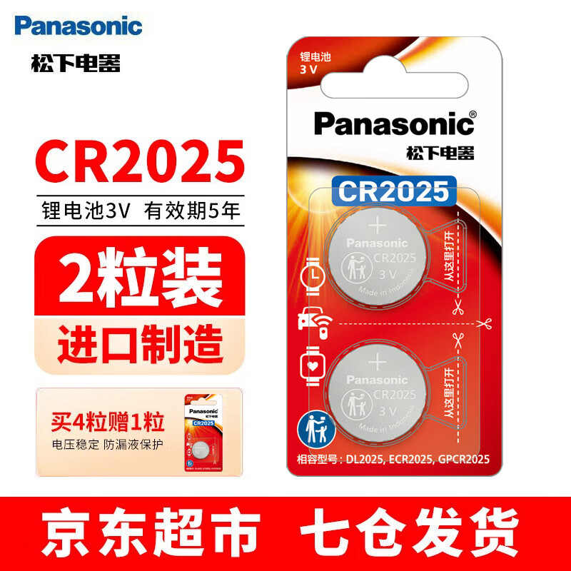 松下(Panasonic) CR2025纽扣电池3V锂扣式电池 奔驰马自达3日产尼桑汽车钥匙遥控电池 CR2025精装2粒