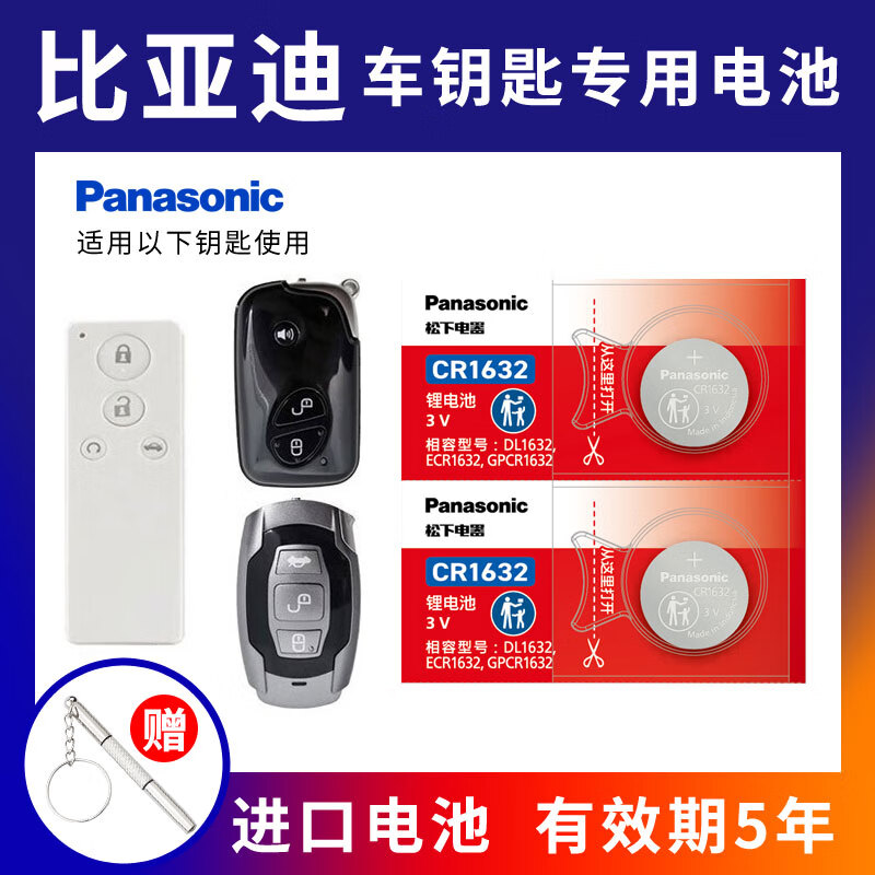 松下(Panasonic)原装CR1632适用于比亚迪车钥匙电池G3 f3 F0 l3 E6 G6 S6 S7秦宋速锐 CR1632【2粒装】