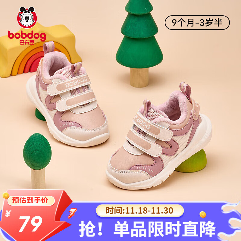 巴布豆学步鞋儿童鞋加绒防滑男女宝宝冬季棉鞋小童运动鞋【清仓捡漏】 藕粉色 (加绒保暖) 17 内长12.1cm 适合脚长11cm