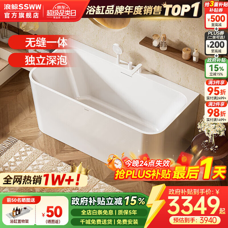 浪鲸(SSWW) 卫浴家用成人亚克力方形浴缸无缝一体泡澡浴缸含下水器0220鲸沐 【1.6m配件缸】