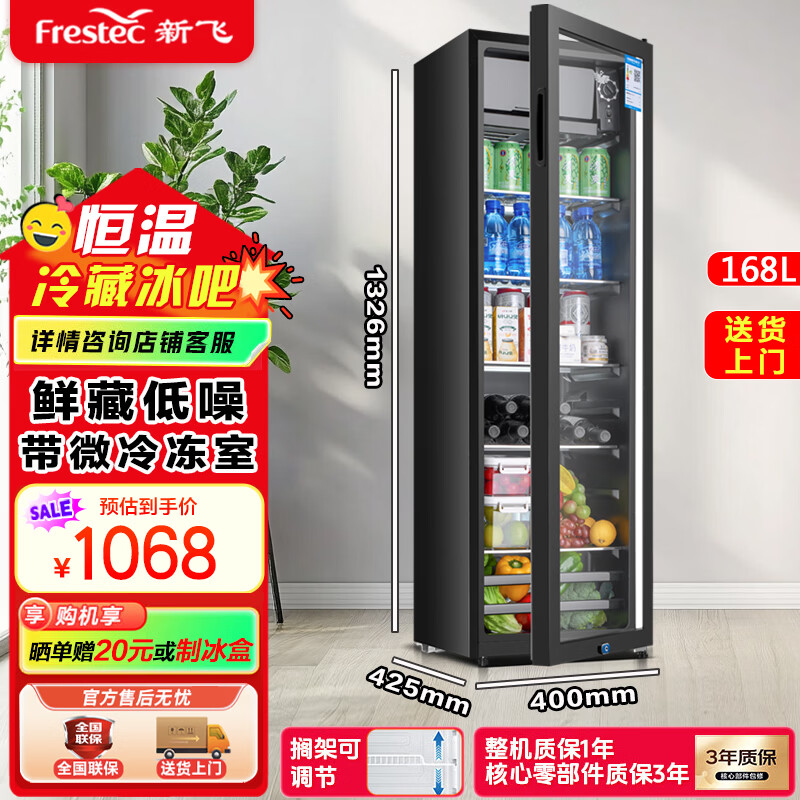 新飞 (Frestec)冰吧冷藏柜保鲜柜 欧式恒温红酒柜酒店家用客厅冰箱迷你小型单门办公室保鲜展示留样茶叶饮料柜 168升黑内胆【冷藏+微冷冻+带灯+带锁】