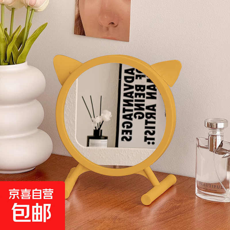可爱卡通猫耳化妆镜家用小型学生宿舍桌面台式镜子办公室美妆镜 轻奢金 20*23cm