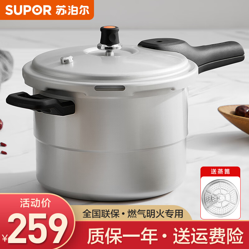 苏泊尔(SUPOR) 高压锅铝合金家用燃气通用大容量加厚防爆大小号快煮压力锅 带蒸篦【9.5L 适合5-7人】 26cm