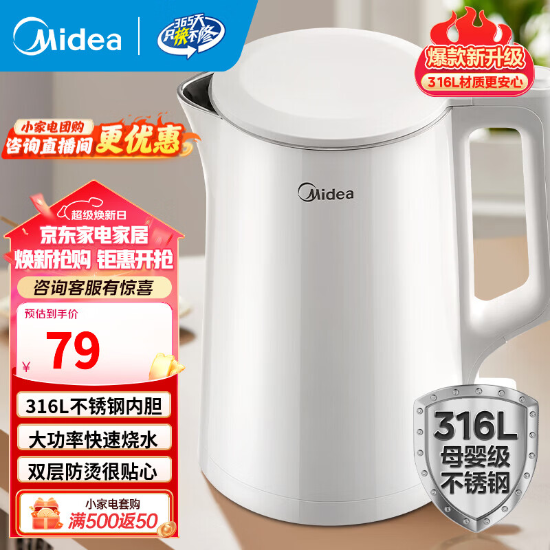 美的(Midea)电热水壶电水壶大容量家用烧水壶泡茶0涂层 食品级304不锈钢自动断电 双层防烫无缝内胆大功率 1.5L 【母婴材质】316L不锈钢