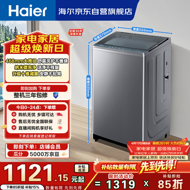 海尔(Haier)全自动波轮洗衣机 10KG直驱变频 大筒径 家用出租 抗菌除螨 家电国家补贴 京东自营 XQB100-BZ23D0