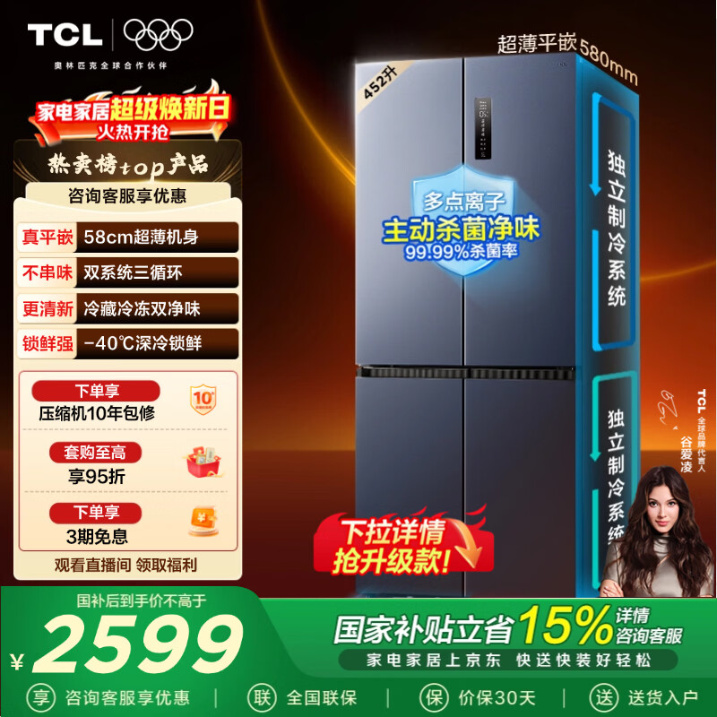 TCL大无界452L十字门冰箱58cm超薄零嵌入双系统三循环一级能效风冷无霜深色R452T9-UQS国家补贴