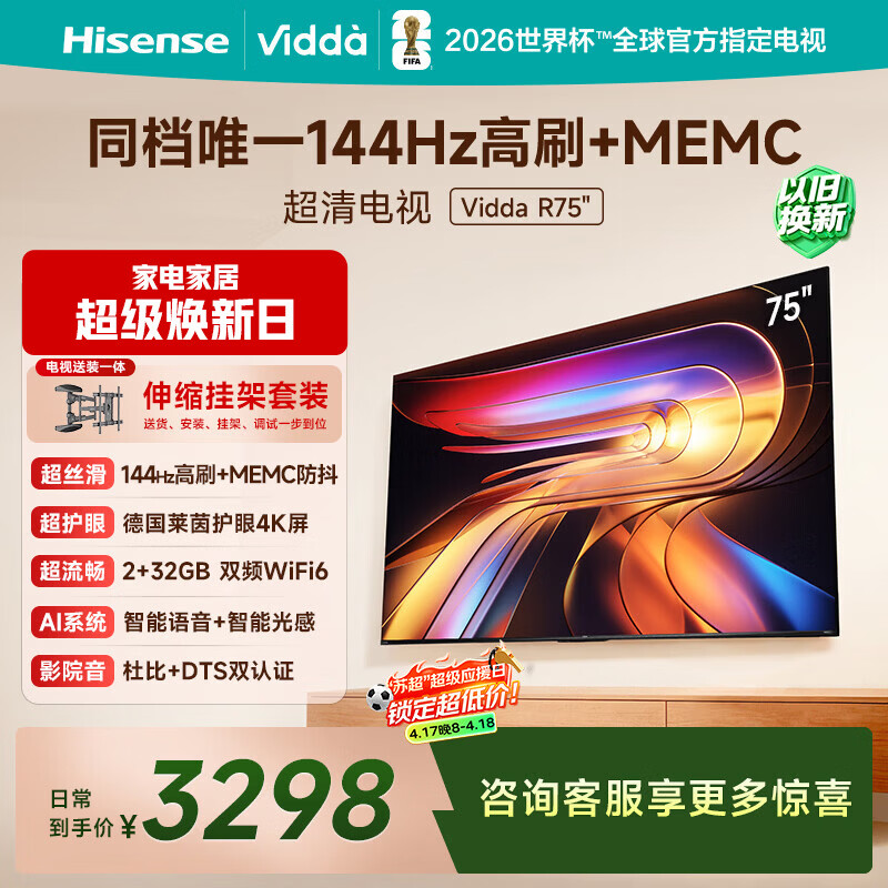 Vidda 海信电视75英寸 R75【伸缩挂架版】144Hz高刷 2+32G 智慧屏 MEMC 以旧换新液晶游戏平板电视机