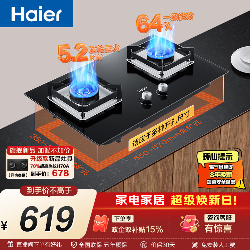 海尔(Haier)【推荐金榜爆款H70A】燃气灶天然气 嵌入式台嵌两用双灶 煤气灶双灶 5.2kw猛火64%高热效BE6(天)