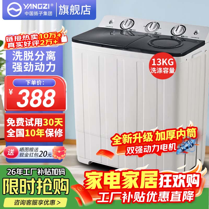 扬子中国扬子集团洗衣机 半自动大容量30KG家用双桶双缸洗衣机脱水双筒 20.5【洗13KG+ 脱7.5KG】蓝光洗护 双缸