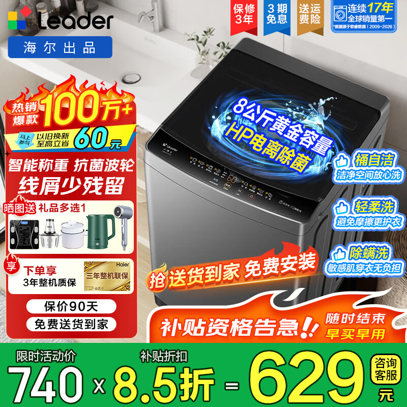 海尔(Haier)海尔波轮洗衣机全自动8/10公斤大神童大容量租房家用神器升级除菌除螨洗柔护内筒以旧换新补贴统帅 电离除菌+15分钟速洗+除菌螨+桶自洁 波轮 8kg