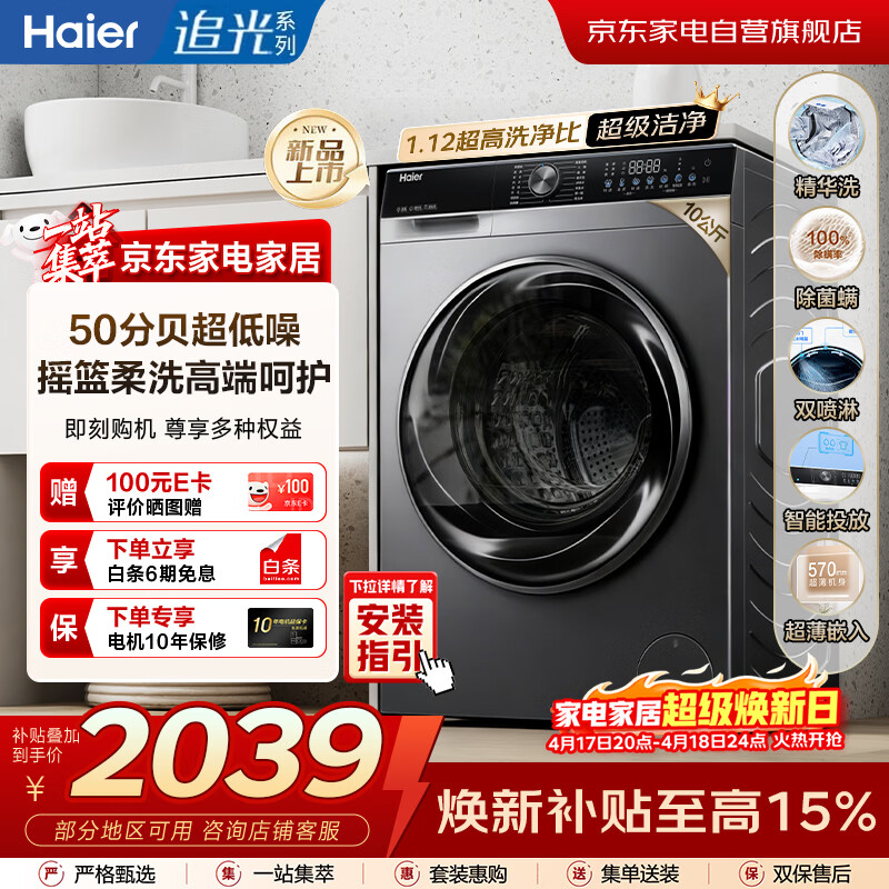 海尔滚筒洗衣机全自动10KG 直驱变频 超薄 精华洗2.0 智投 商场同款 20年防生锈 XQG100-BD38A1