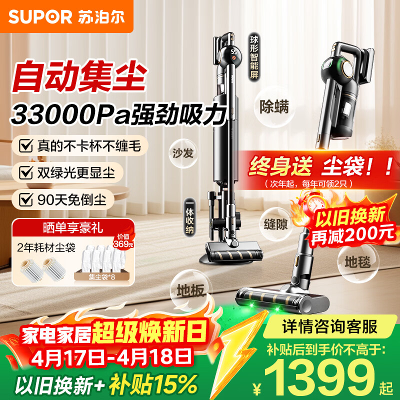 苏泊尔自集尘吸尘器家用无线手持大吸力扫床除螨多功能智能基站绿光集尘管家C36MAX-SL