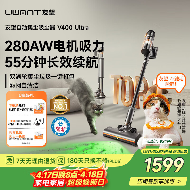 UWANT友望吸尘器V400Ultra 自集尘洗【280AW超强大吸力 55min长续航】活氧杀菌家用无线手持扫地除螨仪