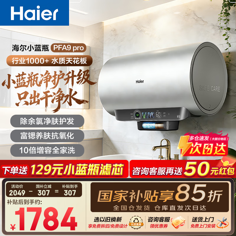 海尔(Haier)国家补贴 电热水器3300W变频速热 无垢鲜活水净水洗 内胆免洗镁棒免换一级能效无缝胆储水式 60L 3300W PFA9pro/小蓝瓶内外双重净水