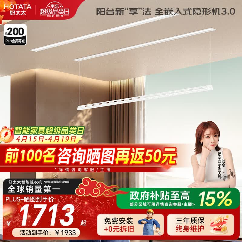 好太太隐形晾衣架电动晾衣机隐藏式自动智能升降阳台嵌入式晒衣架 D-3202T:1.5米双杆被杆+照明