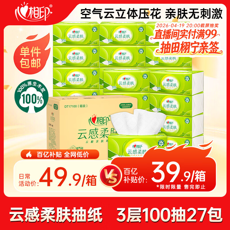 心相印抽纸 纸巾 卫生纸 云感柔肤3层100抽*27包S码 餐巾纸 抽纸整箱