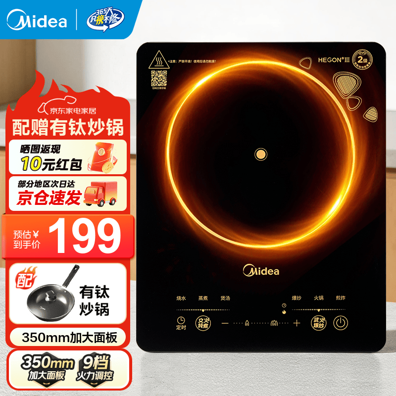美的(Midea)电磁炉电陶炉家用 电磁炉2200W大功率猛火小型耐用易洁面板九档火力电磁灶一体面板智能定时火锅炉 【单灶+单锅】大面板配钛炒锅
