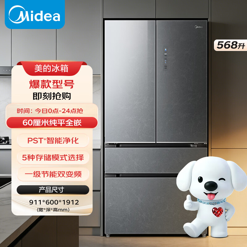 美的(Midea)【真专供】美的小冰狗Bingo568L法式多门60CM纯平全嵌电冰箱BCD-568WUFGPZM(X) 墨兰灰-观澜【专】