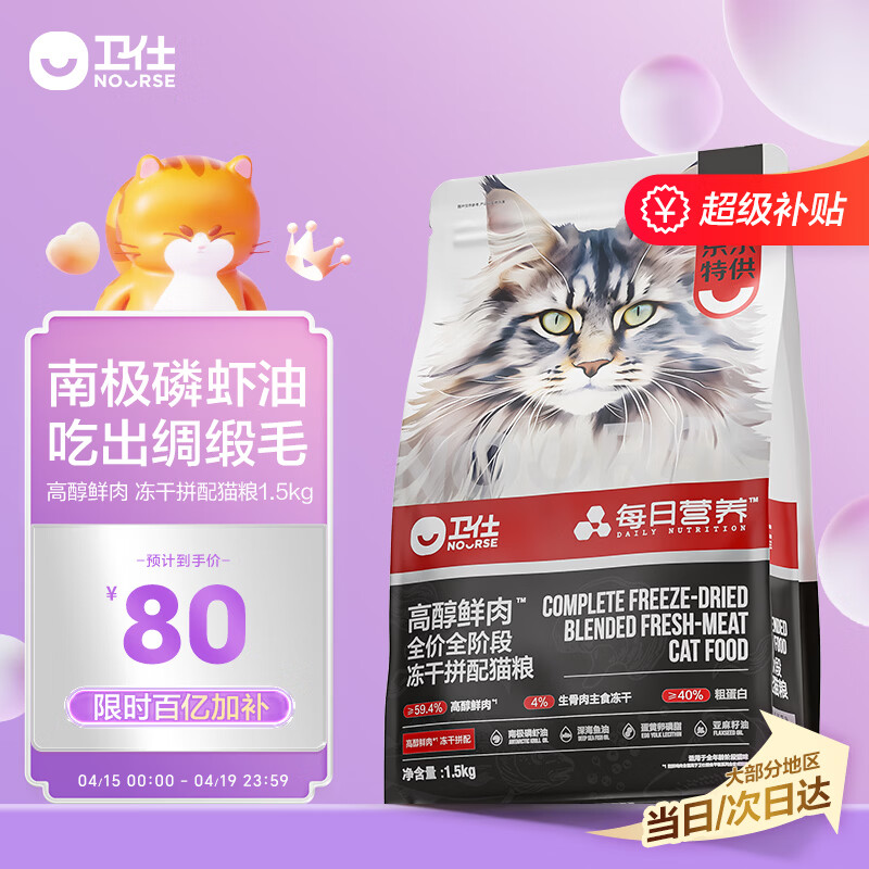卫仕高醇鲜肉 南极磷虾油美毛猫干粮 成猫幼猫全价冻干拼配猫粮1.5kg
