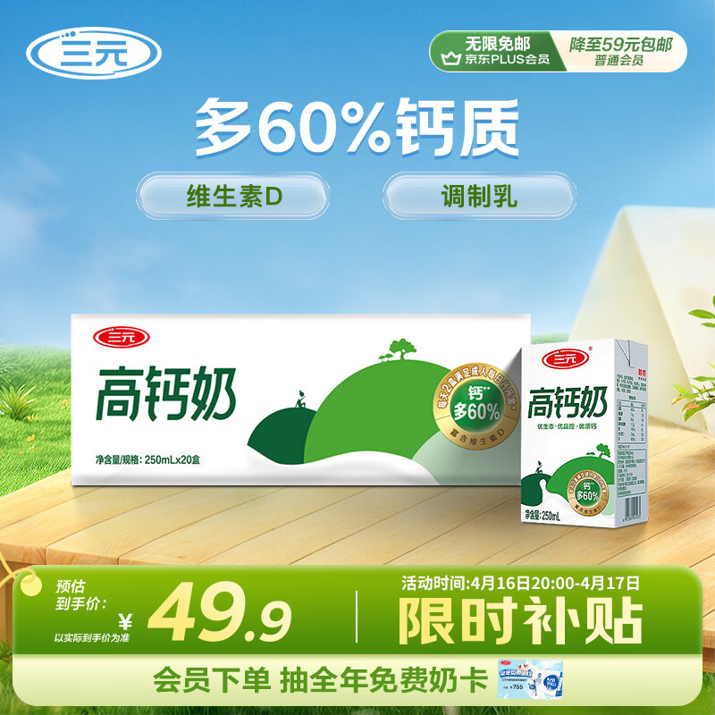 三元方白高钙牛奶整箱250ml*20盒 营养早餐伴侣 整箱送礼