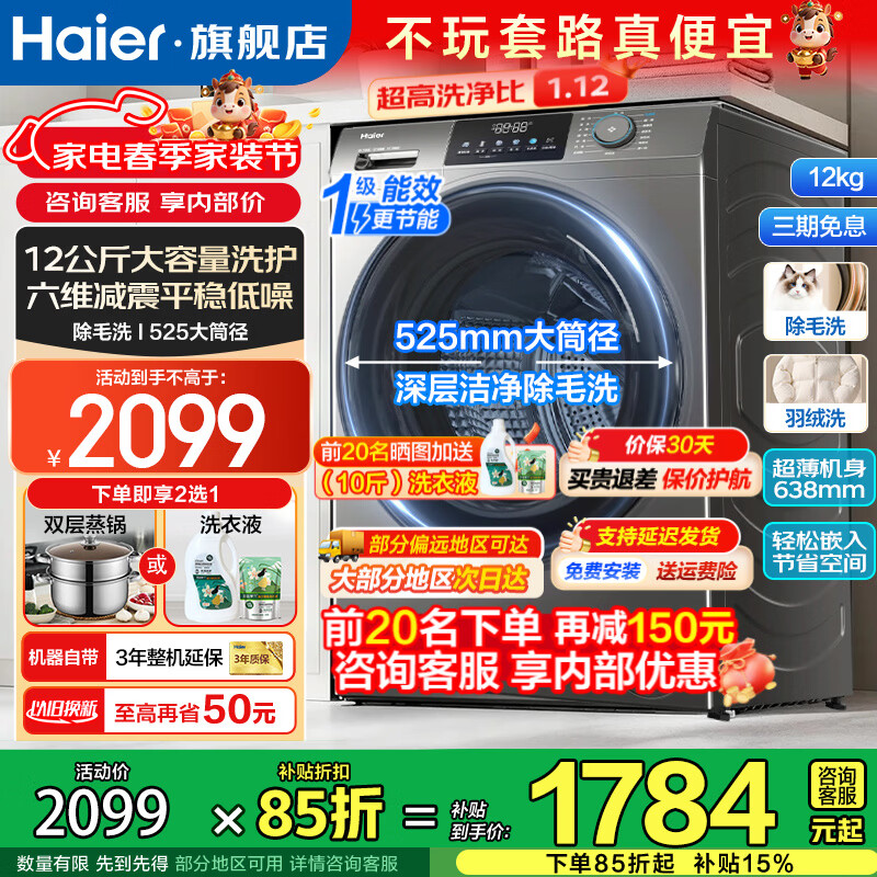 海尔(Haier)12公斤滚筒洗衣机全自动洗烘一体大容量超薄机身除菌螨一级能效省水省电667NH/50DS换新补贴洗衣机 【海尔12公斤50DS】大筒+除毛洗+除菌 滚筒单洗