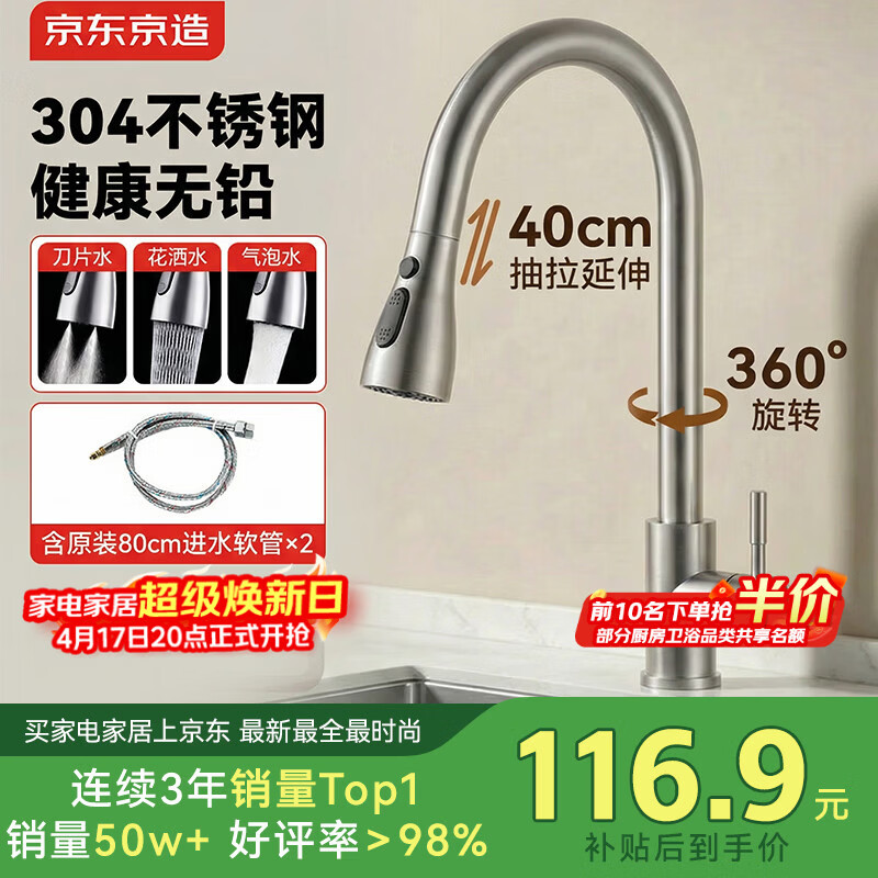 京东京造 厨房水龙头 抽拉式洗菜盆龙头 304不锈钢360°旋转冷热水3功能
