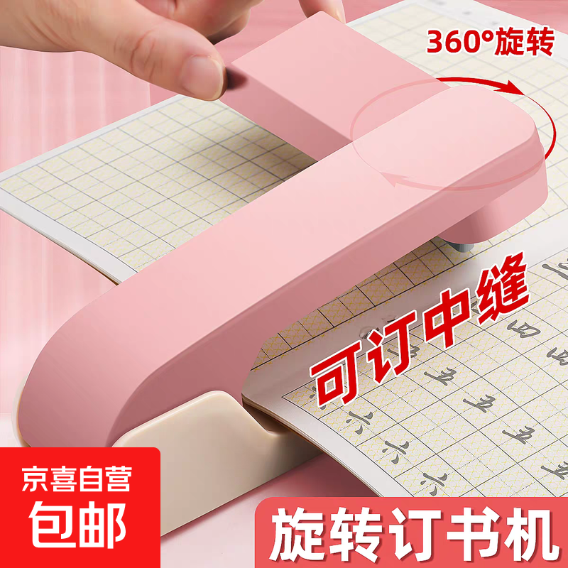 360度可旋转订作业本中缝订书机装订25页学生用订书器办公用大号省力订中缝多功能订标准订书机 ins风/粉色/可订本子中缝/送1000枚订书针