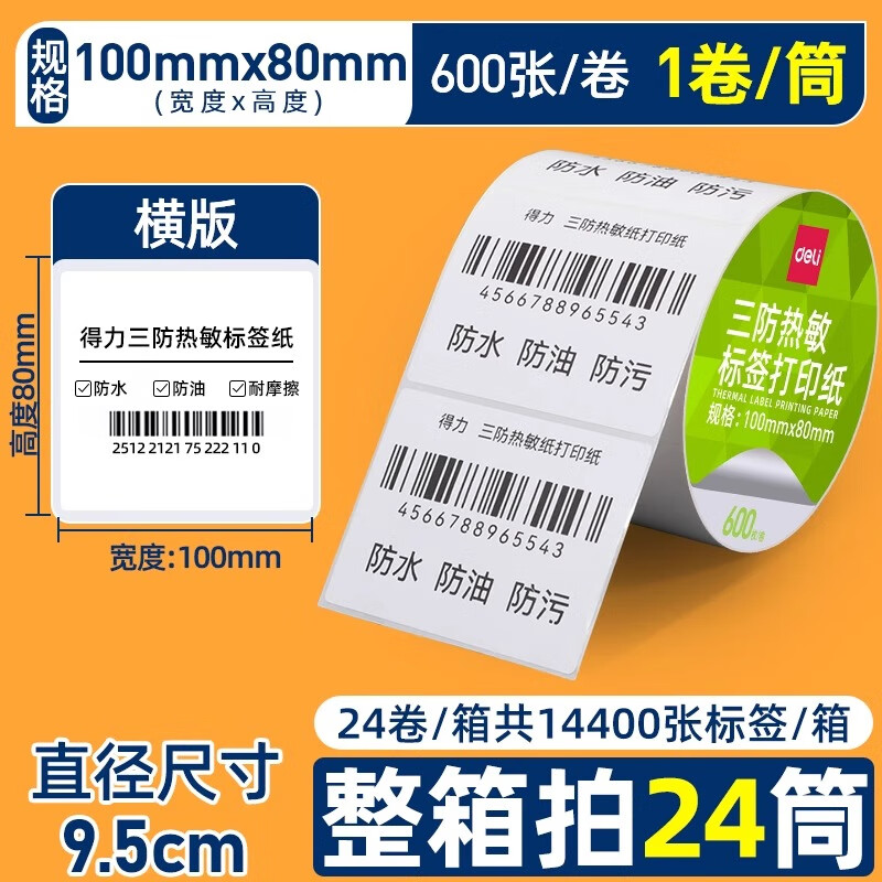 得力(deli)热敏打印纸三防热敏标签纸热敏纸贴纸不干胶快递单超市电子称纸条码纸打印机 100_80_600张_1卷横版