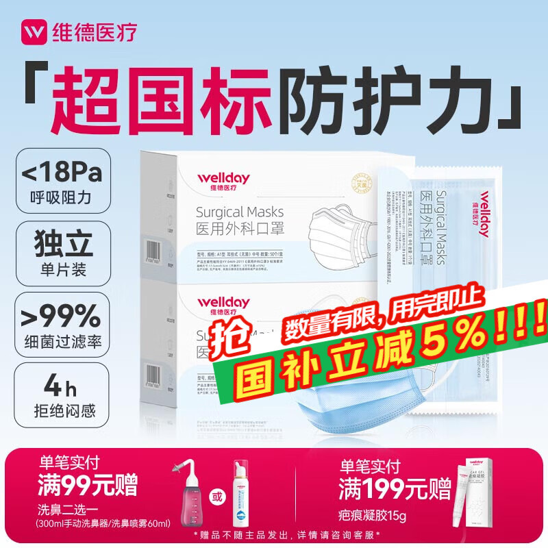 维德(WELLDAY)一次性成人医用外科口罩三层防护防过敏透气灭菌级独立包装100只