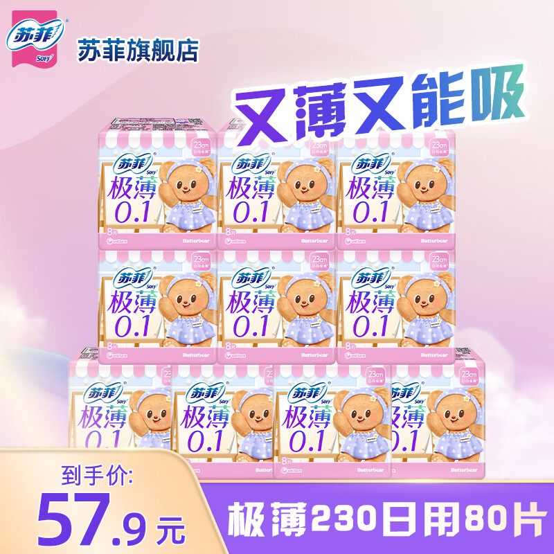 苏菲卫生巾黄油小熊夜用超熟睡420mm柔棉感超长整箱组合装姨妈巾 【囤货】极薄0.1日用230mm80片