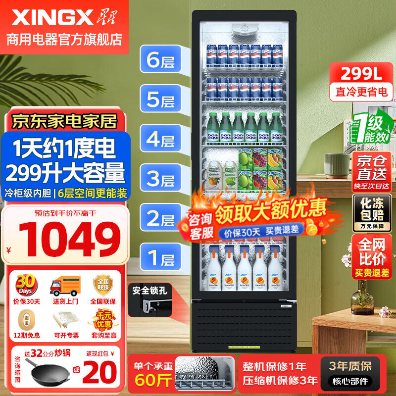 星星(XINGX)展示柜冷藏保鲜柜 风冷除霜饮料柜单门立式冰柜直冷冰箱商用食品留样超市便利店蔬菜水果啤酒水柜 直冷省电 1级能效299升LSC-310YPE