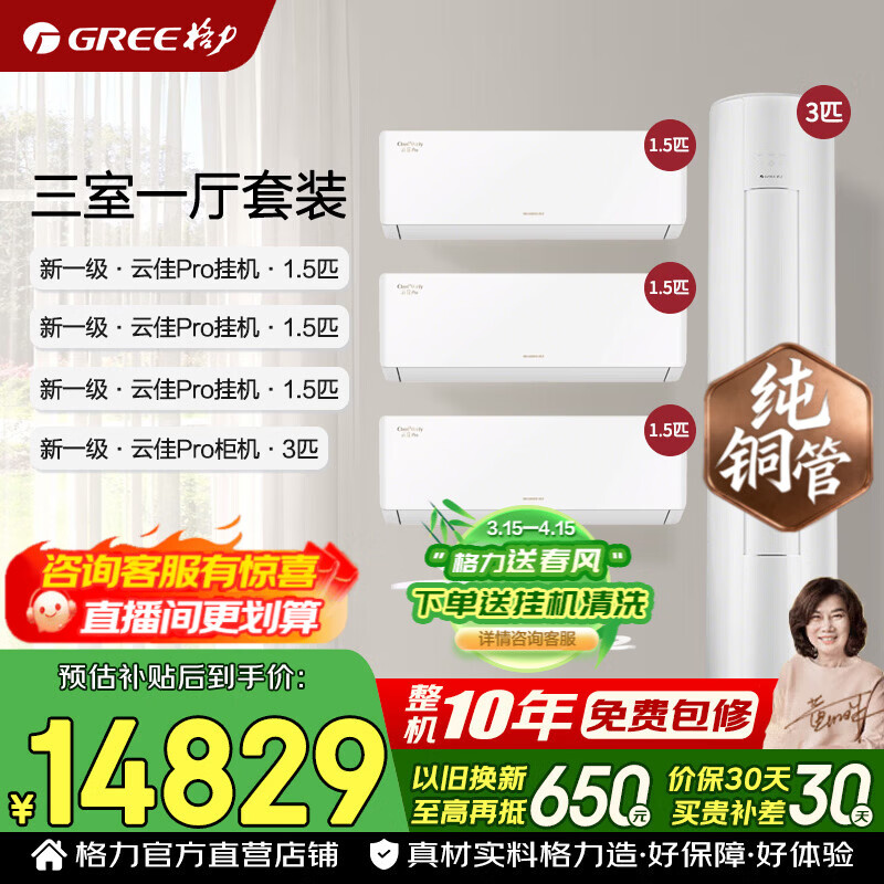 格力空调套装 云佳pro 新一级能效 变频冷暖 纯铜管 节能省电 客厅立式柜机柜挂组合套装 家电国家补贴 【三室一厅】1.5匹云佳Pro*3+3匹云佳Pro