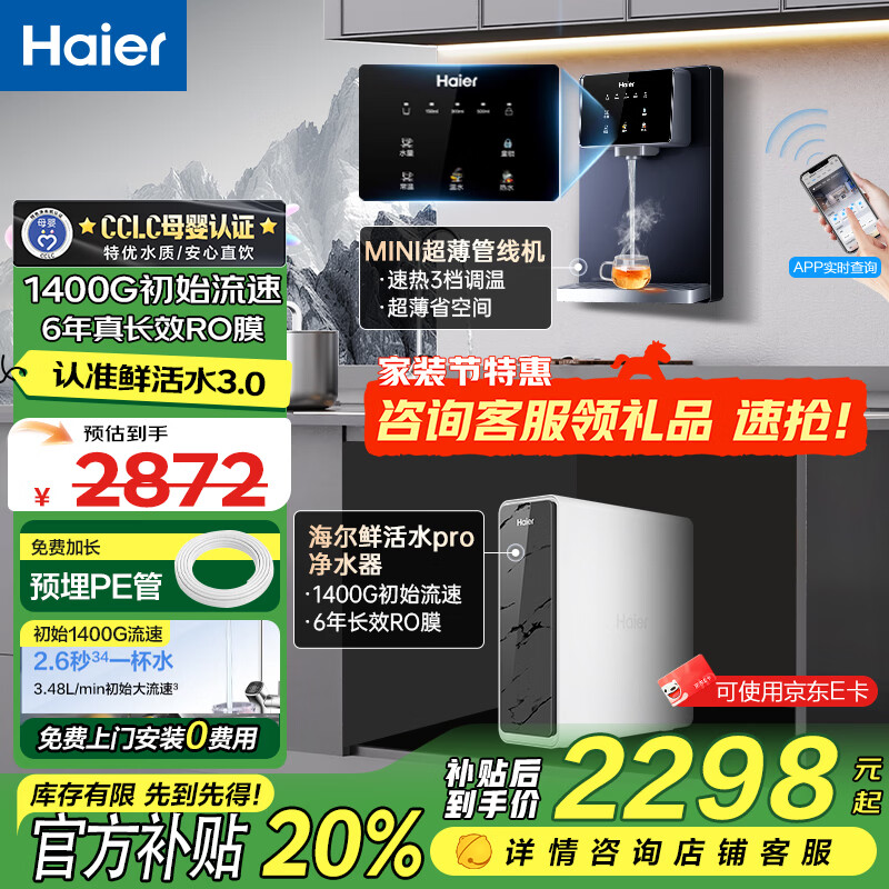 海尔(Haier)鲜活水Pro净水器管线机纯水家用瞬时1400G厨下式6年RO反渗透直饮机一体即热餐边柜R793套装1200G 净水器+新款管线机