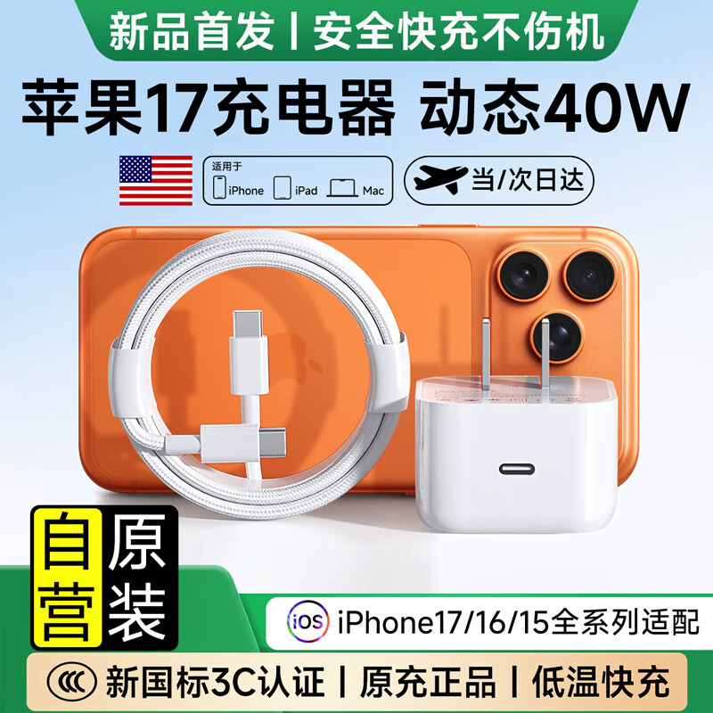 尊匠苹果充电器17-6适配器原装正品充电线13氮化镓30/40W快充线PD套装iPhone14ProMax手机充电头数据线 【苹果17专用】动态40w头+60w数据线