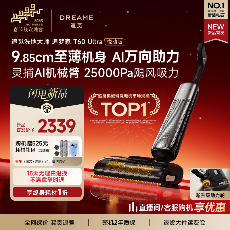 追觅【春晚同款】洗地机追梦家T60Ultra双机械臂9.85cm超薄洗拖吸一体自动清洗拖地机扫地机器人吸尘器 T60Ultra悦动版【万向助力 9.85超薄】