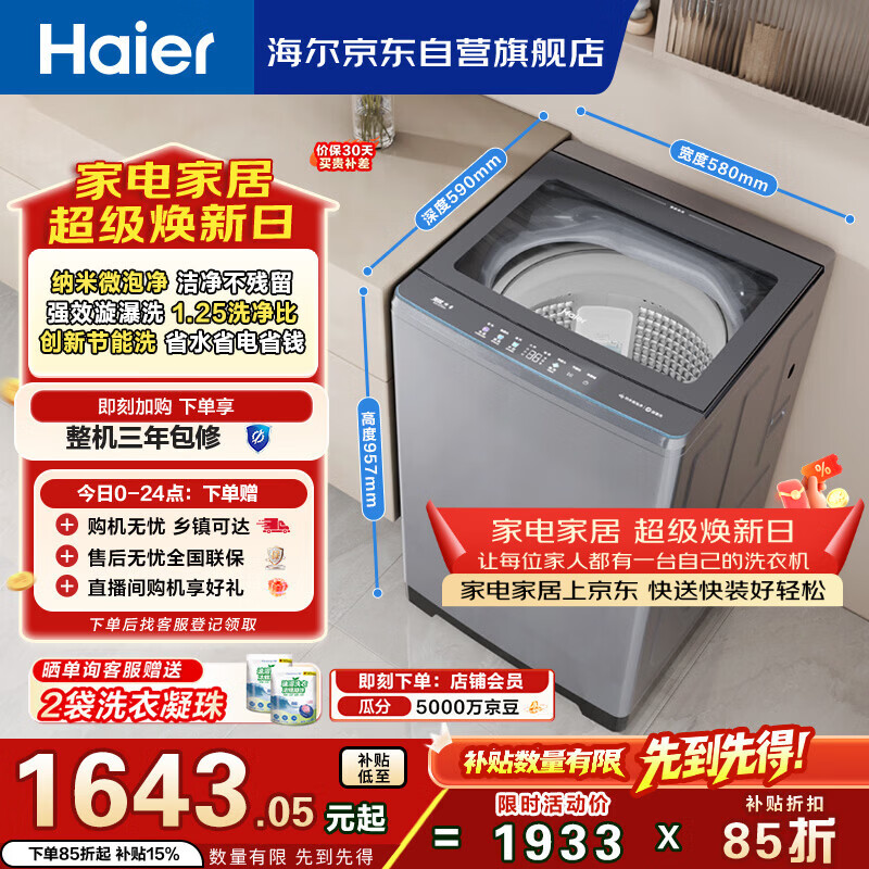 海尔(Haier)全自动波轮洗衣机 13KG大容量巨能洗 大筒径家用 直驱变频 家电国家补贴 京东自营 XQB130-BZ53D